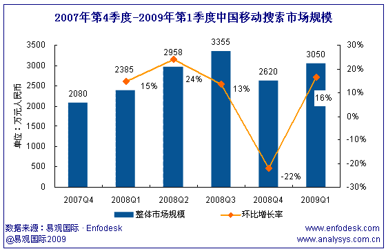 2009年第1季中國移動(dòng)搜索市場收入達(dá)3050萬,環(huán)比增長16%
