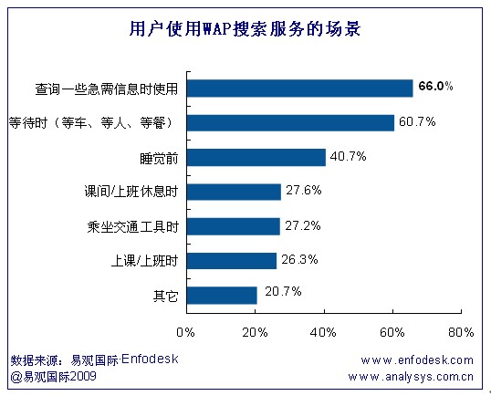 根據(jù)易觀Enfodesk《中國移動搜索市場用戶調(diào)研報(bào)告2009》研究發(fā)現(xiàn),用戶使用WAP搜索服務(wù),一般情況是在查詢一些急需信息和等待時(等車、等人、等餐),這兩類情形的使用比例均在60%以上。值得注意的是,在睡覺前,用戶使用移動搜索服務(wù)的比例達(dá)40.7%。而在其他休閑時間,如課間/上班休息時、乘坐交通工具、上課/上班時也是用戶經(jīng)常使用WAP搜索服務(wù)的場景。