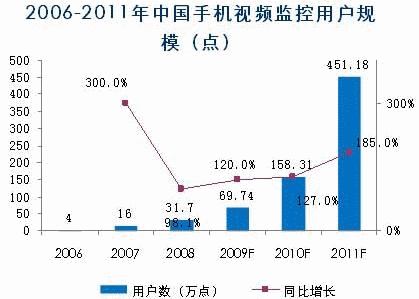 諾達(dá)咨詢預(yù)測,2006年中國手機(jī)監(jiān)控用戶以4萬點(diǎn)計(jì)算,2009年隨著運(yùn)營商3G網(wǎng)絡(luò)建設(shè)和3G業(yè)務(wù)的推進(jìn),用戶數(shù)將有大幅度增長,2010年用戶將達(dá)到158.31萬點(diǎn),2011年達(dá)到451.18萬點(diǎn)。