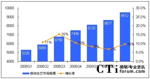 圖:2008~2009年中國移動社交業(yè)務(wù)市場規(guī)模(單位:萬元)