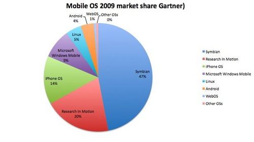 根據(jù)Gartner的數(shù)據(jù)顯示,去年共銷售出的智能手機(jī)達(dá)1.72億部,比前年上漲了24%,然而全世界手機(jī)的銷售總量卻并無(wú)起色(2008年為12.2億部,而2009年為12.1億部。在去年銷售的所有手機(jī)中,智能手機(jī)占14%,較2008(11%)年有所提升。iPhone盡管去年漲勢(shì)迅猛,只占去年各種手機(jī)銷售總量的2%。