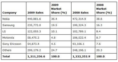 2009年各手機(jī)品牌銷售情況