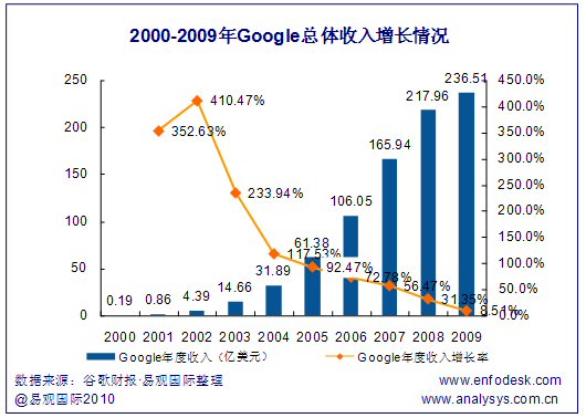 從谷歌的總體營(yíng)收增長(zhǎng)情況可以看出,谷歌雖然保持了相對(duì)平穩(wěn)的整體營(yíng)收增長(zhǎng)態(tài)勢(shì),但是其增長(zhǎng)速率已經(jīng)從2001、2002年超過(guò)300%的高速增長(zhǎng)降低到2009年的8.54%。整體來(lái)看,谷歌的營(yíng)收增長(zhǎng)能力已經(jīng)大幅度降低,減緩收入下滑速度的業(yè)務(wù)發(fā)展壓力下,谷歌需要拓展新的市場(chǎng)以重新構(gòu)建業(yè)務(wù)的高速增長(zhǎng)。