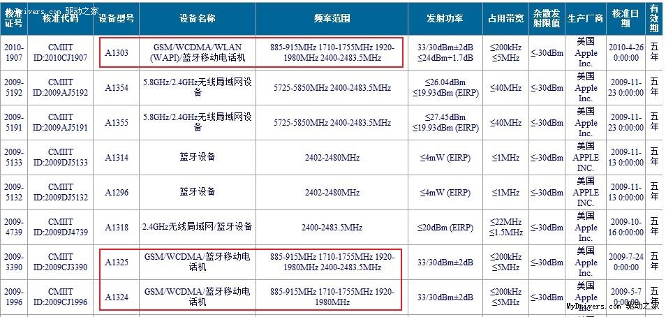 該機型號為A1303,明顯區(qū)別于目前在售的A1324(iPhone 3G)和A1325(iPhone 3GS)。而新機在設(shè)備名稱一欄中的信息更是值得關(guān)注,在原有“GSM/WCDMA/藍牙移動電話機”的基礎(chǔ)上,A1303加入了WLAN(WAPI)功能,如傳言所說一樣提供了對中國標準WAPI的支持,因而也終于迎來了WiFi的回歸。