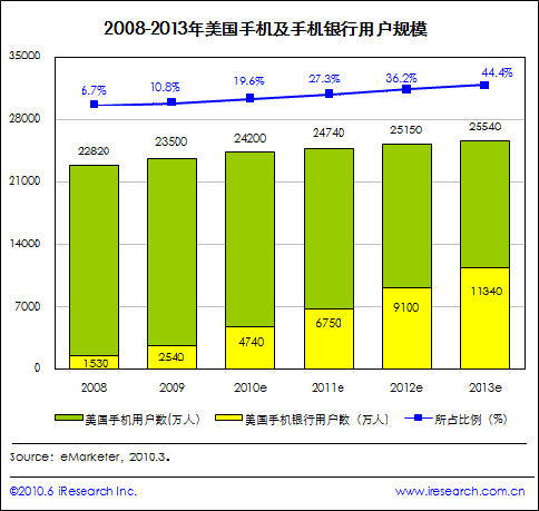 艾瑞咨詢根據(jù)eMarketer的統(tǒng)計(jì)數(shù)據(jù)發(fā)現(xiàn),2010年美國手機(jī)銀行用戶占其手機(jī)用戶的比例將達(dá)到19.6%,到2013年將增長至44.4%。