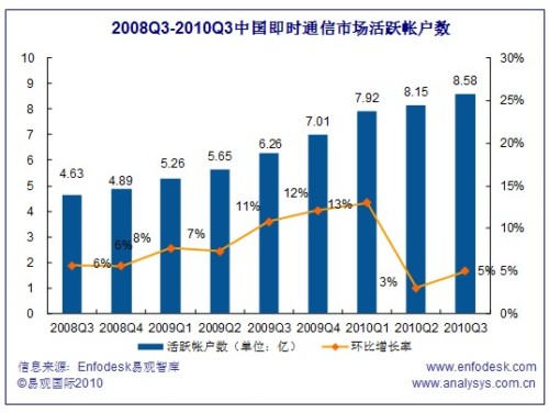 2010Q3中國(guó)即時(shí)通信市場(chǎng)活躍帳戶數(shù)超過(guò)8.58億