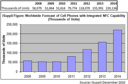 據(jù)市調(diào)機(jī)構(gòu)iSuppli預(yù)估,到2014年,全球內(nèi)建NFC的手機(jī)出貨量可望達(dá)到2.201億部,2010年該數(shù)字為5,260萬(wàn)部。到了2014年,約有13%的手機(jī)內(nèi)建NFC功能,而2010年該數(shù)字為4.1%。