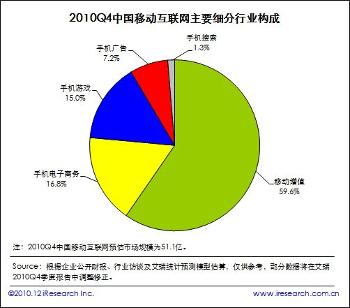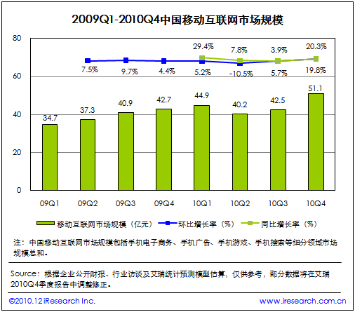 根據(jù)艾瑞咨詢即將發(fā)布的2010年第四季度中國移動互聯(lián)網(wǎng)市場監(jiān)測數(shù)據(jù)顯示,2010Q4中國移動互聯(lián)網(wǎng)市場整體規(guī)模達到51.1億,同比增長19.8%,環(huán)比增長20.3%。艾瑞咨詢分析認為,本季度電信運營商對計費通道治理開始收尾,移動增值市場整體復(fù)蘇。同時手機電子商務(wù)、手機游戲業(yè)務(wù)領(lǐng)域取得良好市場表現(xiàn),受手機應(yīng)用商店、位置簽到服務(wù)等新型手機業(yè)務(wù)創(chuàng)新的帶動,移動互聯(lián)網(wǎng)規(guī)?傮w攀升,投融資比重增加。