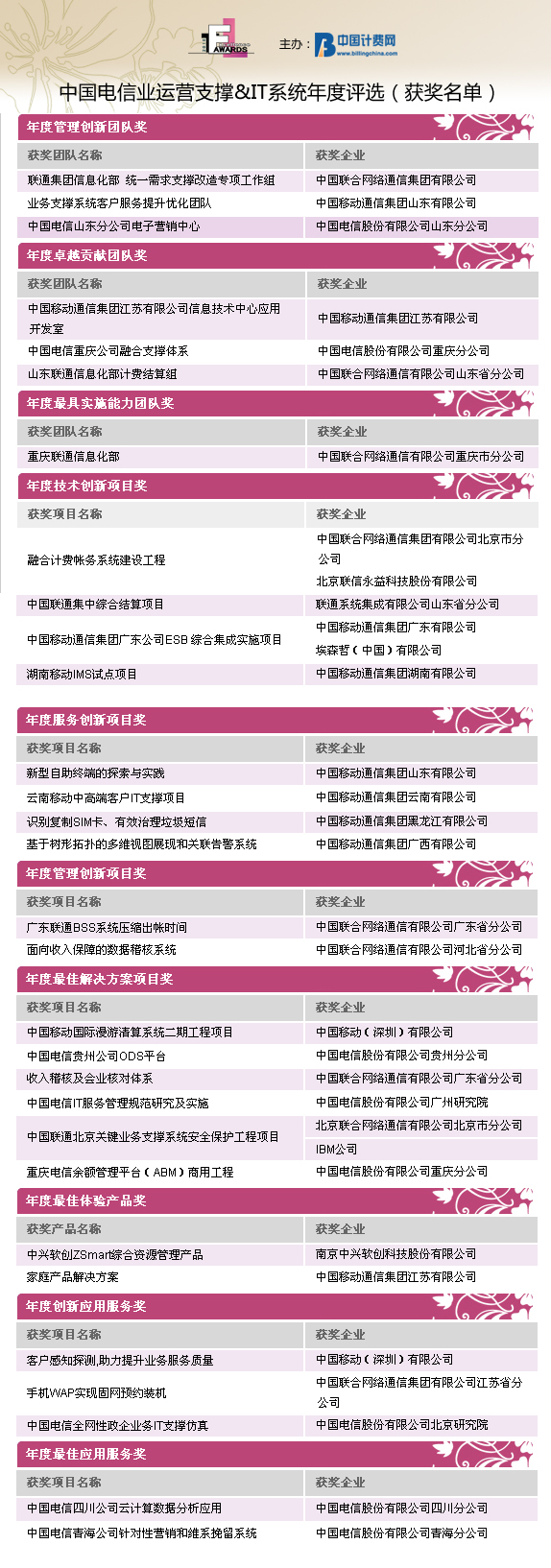 由中國計(jì)費(fèi)網(wǎng)(www.billingchina.com)主辦的“Awards2010”第四屆中國電信業(yè)運(yùn)營支撐&IT系統(tǒng)年度評選活動的結(jié)果于2011年元月31日隆重揭曉。自2010年12月1日評選活動正式啟動以來,歷時(shí)兩個(gè)月,來自國內(nèi)運(yùn)營商集團(tuán)、省級公司、IT產(chǎn)品與服務(wù)提供商的42家企業(yè)的優(yōu)秀產(chǎn)品、項(xiàng)目和團(tuán)隊(duì)共計(jì)70份參評項(xiàng)目入圍評選。經(jīng)過全面征集、選拔、初審以及評委團(tuán)的嚴(yán)格評審,評選結(jié)果已經(jīng)公示。在30位來自運(yùn)營商IT支撐、業(yè)務(wù)和服務(wù)部門的威權(quán)評委們的認(rèn)真評審后,共有27家企業(yè)分別獲得了30個(gè)Awards2010的團(tuán)隊(duì)/項(xiàng)目/產(chǎn)品/應(yīng)用服務(wù)的榮譽(yù)桂冠。