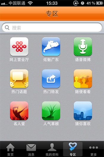 記者在測(cè)試中發(fā)現(xiàn),聯(lián)通語(yǔ)音微博整體界面為醒目的聯(lián)通標(biāo)準(zhǔn)色,并內(nèi)置了聯(lián)通專(zhuān)區(qū)、聯(lián)通網(wǎng)上營(yíng)業(yè)廳、廣東聯(lián)通炫魅廣東等定制應(yīng)用服務(wù)。