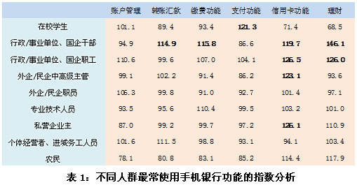在本次調(diào)研中,對不同人群最常使用手機(jī)銀行功能的指數(shù)分析表明,在校學(xué)生更傾向于經(jīng)常使用手機(jī)銀行支付功能,較少使用手機(jī)理財(cái)功能;行政/事業(yè)單位、國企干部更傾向于使用手機(jī)銀行的轉(zhuǎn)賬匯款功能、繳費(fèi)功能、信用卡功能和理財(cái)功能,尤其是理財(cái)功能;行政/事業(yè)單位、國企職工經(jīng)常使用信用卡功能和理財(cái)功能的傾向性也非常明顯;外企/民企中高級(jí)主管則更傾向于經(jīng)常使用信用卡功能;私營企業(yè)主經(jīng)常使用手機(jī)銀行信用卡功能的傾向性顯著。