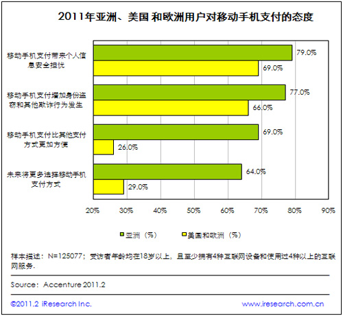 iResearch艾瑞咨詢根據(jù)Accenture的研究調(diào)查數(shù)據(jù)發(fā)現(xiàn),移動(dòng)手機(jī)支付安全問題受到全球用戶的普遍關(guān)心。根據(jù)2011年Accenture對(duì)亞洲、美國(guó)以及歐洲125077位手機(jī)用戶進(jìn)行的網(wǎng)上調(diào)查顯示,亞洲79%的受訪者擔(dān)心移動(dòng)手機(jī)支付帶來的個(gè)人信息安全隱患,77%的受訪者擔(dān)心身份盜竊和其他欺詐行為的發(fā)生;美國(guó)和歐洲擔(dān)心以上安全問題的用戶也分別占到69%和66%。