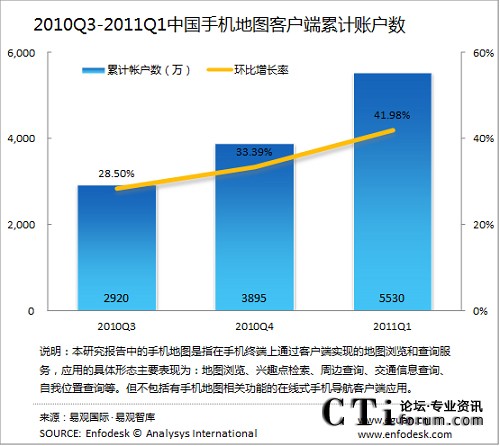 2011年第1季度中國(guó)手機(jī)地圖客戶端累計(jì)賬戶達(dá)5530萬(wàn)