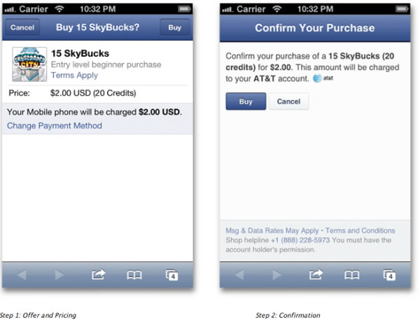 現(xiàn)在,針對(duì)應(yīng)用內(nèi)支付,F(xiàn)acebook聯(lián)合移動(dòng)運(yùn)營商推出了便捷的支付服務(wù),允許用戶在購買Facebook應(yīng)用開發(fā)商所提供的服務(wù)、游戲或者升級(jí)服務(wù)時(shí),直接將交易費(fèi)記到電話賬單當(dāng)中。整個(gè)流程被簡(jiǎn)化成2步:首先用戶選擇需要購買的服務(wù),然后打開支付窗口,點(diǎn)擊確認(rèn)即可。