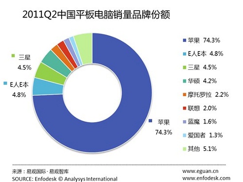 CTI論壇(ctiforum)7月21日消息(記者 楊佳林):根據(jù)易觀智庫最新數(shù)據(jù)顯示,在2011年第2季度蘋果iPad市場銷量份額環(huán)比下滑5.14%,至74.30%。其次是E人E本,占據(jù)了4.82%。三星位列第三。伴隨品牌平板電腦集體上市,以愛國者、藍魔為代表的消費類電子廠商的平板電腦均收到一定影響,市場銷量和份額均有不同程度下降。