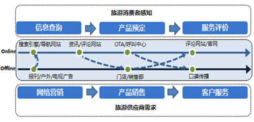 從旅游供應(yīng)商的維度出發(fā),缺失的兩個環(huán)節(jié)往往對其訂單生成有決定性意義。一方面是在網(wǎng)民獲取旅游信息的環(huán)節(jié)借助互聯(lián)網(wǎng)展示及搜索廣告進行品牌曝光及活動營銷,提升企業(yè)的品牌知名度及銷售轉(zhuǎn)化率。另一方面是在網(wǎng)民針對旅游服務(wù)進行評價及分享的環(huán)節(jié)及時解答服務(wù)疑問引導評論主題,通過口碑因素提高老用戶APRU值并帶來新用戶。