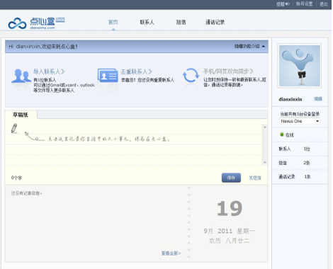 點(diǎn)心盒同步的另一特色功能就是云端收發(fā)短信和查看通話記錄。由于點(diǎn)心盒同步開(kāi)啟自動(dòng)同步之后是即時(shí)同步的,即使忘記帶手機(jī)也沒(méi)有關(guān)系,可以通過(guò)登陸點(diǎn)心盒網(wǎng)站來(lái)查看短信和通話記錄,這樣就可以看到?jīng)]帶手機(jī)期間誰(shuí)聯(lián)系過(guò)自己,可通過(guò)云端進(jìn)行短信收發(fā),而且可利用云端來(lái)快速大量發(fā)送短信。用戶只需一臺(tái)可以上網(wǎng)的電腦或Pad,登錄點(diǎn)心盒,就可以隨時(shí)隨地打開(kāi)網(wǎng)頁(yè)瀏覽手機(jī)里的資料。