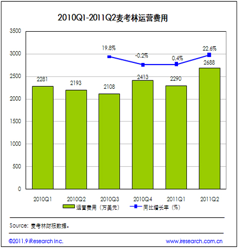 2011Q2麥考林運(yùn)營(yíng)費(fèi)用為2688萬(wàn)美元,同比增加22.6%。據(jù)麥考林CFO披露,2011Q2市場(chǎng)營(yíng)銷費(fèi)用收入的比例為14%,即822萬(wàn)美元(2011Q1市場(chǎng)營(yíng)銷費(fèi)用收入比例為13%,即625萬(wàn)美元,且60%用于線上渠道,40%用于呼叫中心渠道),行政與管理費(fèi)用達(dá)到1774萬(wàn)美元的水平。