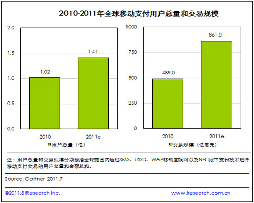 整理Gartner的最新數(shù)據研究發(fā)現(xiàn),預計2011年全球移動支付用戶規(guī)模將達到1.41億,較2010年增長38.2%;交易金額也將由2010年的489億美元增長至861億美元,增長率超過76%。該數(shù)據顯示,全球移動支付市場呈現(xiàn)穩(wěn)步增長態(tài)勢,而交易金額的增長速度遠遠超過用戶數(shù)量的增長速度也表明人們對于移動支付方式的依賴正在逐步加深。