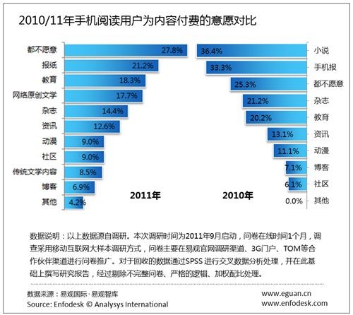 據(jù)易觀國(guó)際(Analysys International)《2011年中國(guó)手機(jī)閱讀市場(chǎng)用戶研究報(bào)告》研究發(fā)現(xiàn),2011年整體手機(jī)閱讀市場(chǎng)付費(fèi)意愿有所降低。