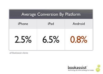 當(dāng)你看到以下數(shù)據(jù)時(shí),會(huì)覺得很有趣,Android用戶帶來(lái)的轉(zhuǎn)化率遠(yuǎn)低于平均水平,僅為0.8%;iPhone用戶帶來(lái)的轉(zhuǎn)化率是Android的3倍,為2.5%;而iPad用戶帶來(lái)的轉(zhuǎn)化率是Android的8倍,為6.5%。iPad帶來(lái)的轉(zhuǎn)化率出奇的高,體現(xiàn)了消費(fèi)者使用iPad的熱情。所以酒店經(jīng)營(yíng)者應(yīng)該優(yōu)先考慮此平臺(tái),確保他們的網(wǎng)站都針對(duì)iPad進(jìn)行了優(yōu)化。