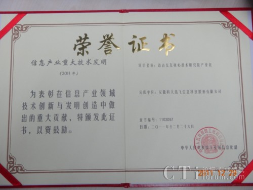| 訊飛語音識(shí)別技術(shù)產(chǎn)品獲CTI論壇編輯推薦獎(jiǎng) 2011-12-29 |