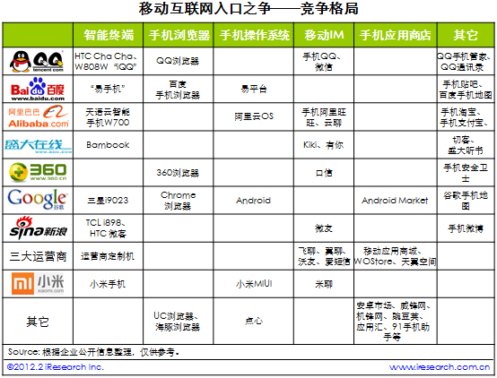 從下表中可看出,騰訊、百度、阿里巴巴、盛大、谷歌、新浪、三大運營商和小米科技在移動終端硬件和軟件上都有布局,而根據(jù)各家的不同優(yōu)勢,幾乎都有至少一個用戶量級、影響力發(fā)展的較好的應(yīng)用軟件,如騰訊的手機QQ、微信,百度的手機搜索、手機地圖,阿里巴巴的手機淘寶、手機支付寶,盛大的Bambook、切客,360的手機安全衛(wèi)士,谷歌的Android系統(tǒng)、Chrome瀏覽器,新浪的手機微博,三大運營商的定制手機,小米的小米手機、米聊。