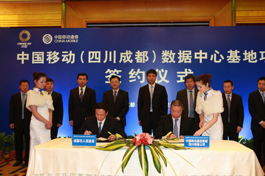2012年2月22日,中國(guó)移動(dòng)(四川成都)數(shù)據(jù)中心基地項(xiàng)目在四川成都正式簽約啟動(dòng)。成都市政府葛紅林市長(zhǎng)、劉超常委、白剛副市長(zhǎng)與中國(guó)移動(dòng)通信集團(tuán)公司魯向東副總裁、中國(guó)移動(dòng)四川公司簡(jiǎn)勤總經(jīng)理等出席簽約儀式,成都市政府與中國(guó)移動(dòng)四川公司代表雙方簽署合作協(xié)議。