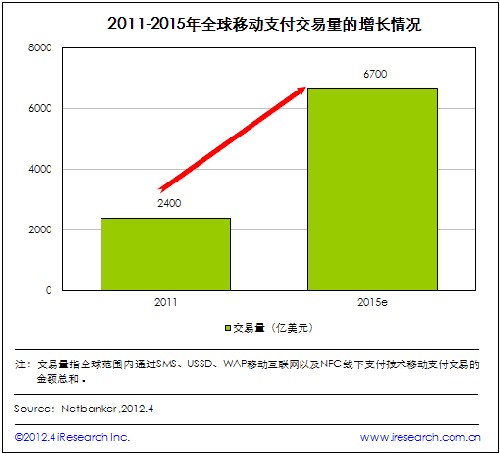 iResearch艾瑞咨詢整理Netbanker的最新數(shù)據(jù)發(fā)現(xiàn),2011年全球移動(dòng)支付交易量達(dá)到2400億美元。該統(tǒng)計(jì)數(shù)據(jù)顯示,2015年全球移動(dòng)支付交易量將達(dá)到6700億美元,使用手機(jī)銀行應(yīng)用程序的用戶數(shù)量較2010年將增加45%左右。另外,預(yù)計(jì)在未來18個(gè)月內(nèi)還會(huì)有20個(gè)國家增設(shè)NFC服務(wù)。
