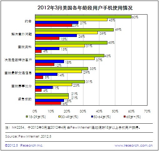 iResearch艾瑞咨詢根據(jù)Pew Internet 2012年5月發(fā)布的數(shù)據(jù)整理發(fā)現(xiàn),美國(guó)各年齡段手機(jī)用戶中,18-29歲的用戶使用手機(jī)程度最為頻繁,主要用于“約會(huì)”“解決意外問題”及“查找資料”上。相比其他年齡段用戶群,年輕用戶更偏向利用移動(dòng)手機(jī)來(lái)獲取信息。