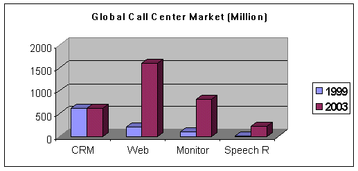 。。在1999年,全球呼叫中心應(yīng)用軟件的市場(chǎng)總值為29億美元,到2003年這一數(shù)字將增長(zhǎng)近三倍,達(dá)到85億美元。這一增長(zhǎng)主要來(lái)源于對(duì)基于互聯(lián)網(wǎng)呼叫應(yīng)用軟件以及呼叫監(jiān)控解決方案的需求。Data-monitor 市場(chǎng)分析專家在1999年針對(duì)呼叫中心軟件市場(chǎng)進(jìn)行調(diào)研,具體數(shù)字詳見(jiàn)下表: