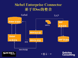 在這個名為Siebel Enterprise Connector的中間軟件中,這種整合通過兩個方法來實現(xiàn)。一是通過中間文件(Intermediate Document IDoc)實現(xiàn)的整合(圖示一),它可以把SAP中的基本信息輸入到Siebel中,其中IDocs接收器接收從SAP服務器中存儲的關于客戶戶口、聯(lián)系人、產(chǎn)品和價格等信息,然后把這些信息存入IDocs界面中,這個界面是Siebel的整合管理(Enterprise Integration Manager,EIM)的一部分,于是這些信息就可以完全傳入到Siebel中。這樣的整合不僅在CRM最初啟動的時候可以用來進行數(shù)據(jù)轉化,而且在ERP和CRM的同步運行中還能不斷地把最新調整的產(chǎn)品目錄、價格和折扣等信息輸入到前端軟件中,讓銷售人員可以及時地給出正確的報價。