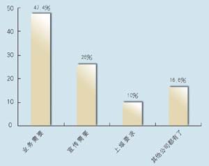 在問到對CRM的熟悉程度方面,有12家表示熟悉,占到63.2%,另有7家表示不熟悉,說明許多企業(yè)已經(jīng)對CRM有一定了解,不過也仍有相當大的市場空間。其中有8家建立了CRM系統(tǒng),占到42%,計劃建立的有9家,占到47.4%,而有2家表示短期不會建立。從調(diào)查發(fā)現(xiàn),幾乎所有受訪者都接受和認同CRM,盡管有一些企業(yè)還不熟悉,但在調(diào)查問卷中對此表現(xiàn)出極大的興趣。在CRM的采購動機上,有9家表示是為了提高業(yè)務,占到將近一半的比例(47.4%),而有5家表示出于企業(yè)宣傳,2家屬于上級主管部門要求,有3家表示是出于同行的示范。調(diào)查顯示,企業(yè)獲得CRM的信息來源很廣,最多的是通過報刊雜志的廣告,有6家,占31.6%,而上級推薦和供應商推薦各有4家,各占21%,有兩家是集成商推薦,此外還有3家通過展會獲得相關信息。