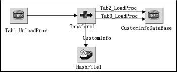 由于不同的源數(shù)據(jù)中可能包含同一個(gè)客戶的信息,因此采用Hashed File Stage HF_khjbxx存放輸出結(jié)果,相同客戶的信息根據(jù)客戶編碼覆蓋前面產(chǎn)生的信息,避免了重復(fù)的客戶信息。從不同源數(shù)據(jù)庫(kù)取得客戶信息,根據(jù)數(shù)據(jù)的真實(shí)性依次進(jìn)行處理后,生成的客戶信息全部保存在一個(gè)Hash文件中,最后從Hash文件中取出結(jié)果數(shù)據(jù)裝載到目標(biāo)數(shù)據(jù)庫(kù)中。
