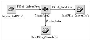 客戶信息數(shù)據(jù)庫(kù)中的各表以客戶編碼為關(guān)鍵字進(jìn)行關(guān)聯(lián),客戶編碼是由客戶的證件號(hào)碼經(jīng)過(guò)專門的算法計(jì)算產(chǎn)生的唯一客戶標(biāo)識(shí)。根據(jù)各個(gè)系統(tǒng)中客戶數(shù)據(jù)與新系統(tǒng)客戶信息的對(duì)照關(guān)系我們?cè)O(shè)計(jì)數(shù)據(jù)抽取轉(zhuǎn)換的程序,如圖4所示是一個(gè)DataStage的Job。
