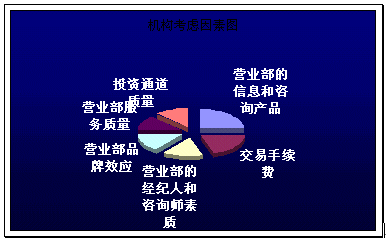 。。具筆者調(diào)查,現(xiàn)在對營業(yè)部盈利最大的是機構客戶或者大額個人投資者,而隨著股市行情的低彌,他們在選取營業(yè)部的考慮因素主要關鍵點及其所占比例如下圖: