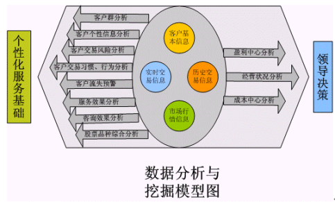 。。從上圖可以看出,在這個客戶信息數(shù)據分析模塊當中,主要分析對象是客戶的基本信息、客戶的實時交易信息、客戶的歷史交易信息、客戶帳戶信息和市場行情信息等幾個處于孤島形狀的信息模塊。而得到的分析結果應該包括如下幾個基本方面,以被為領導的決策和企業(yè)的業(yè)務流程服務: