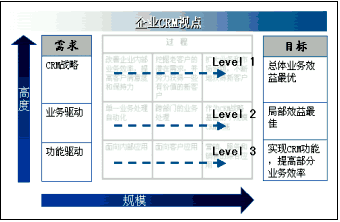 從全球CRM最佳實(shí)踐來看,企業(yè)實(shí)施CRM不外乎CRM軟件功能驅(qū)動(dòng)、業(yè)務(wù)驅(qū)動(dòng)和客戶關(guān)系戰(zhàn)略驅(qū)動(dòng)三種情況。所以,實(shí)施CRM的視點(diǎn)也有三種,如下圖所示:一是,從CRM產(chǎn)品功能角度,根據(jù)產(chǎn)品所能提供的功能,選擇自己需要實(shí)施的CRM內(nèi)容。這種視點(diǎn)充其量只能夠讓企業(yè)擁有部分CRM的功能,有限地提高部分業(yè)務(wù)處理的效率。二是,從業(yè)務(wù)角度出發(fā),通過局部優(yōu)化業(yè)務(wù)流程,實(shí)施CRM。在項(xiàng)目中所涉及的業(yè)務(wù)流程可能要貫穿多個(gè)CRM功能模塊。這種視點(diǎn)解決了一部分業(yè)務(wù)問題,它主要以流程效益或部門效益最優(yōu)為目標(biāo)。三是,從企業(yè)CRM戰(zhàn)略角度出發(fā),從總體、全局、發(fā)展的高度規(guī)劃和實(shí)施CRM。CRM戰(zhàn)略驅(qū)動(dòng)視點(diǎn)不僅追求局部效益最優(yōu),而且能夠?qū)崿F(xiàn)企業(yè)總體業(yè)務(wù)效益的最大化。雖然,企業(yè)可以根據(jù)自身客戶關(guān)系管理的實(shí)際情況選擇CRM視點(diǎn)的高度,但是在絕大多數(shù)企業(yè)的實(shí)踐中,都會選擇CRM戰(zhàn)略高度作為著眼點(diǎn),規(guī)劃企業(yè)客戶關(guān)系管理。