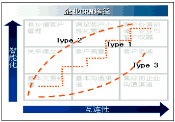 1是"小步快跑"型,Type 2是"改革優(yōu)先"型,Type 3是"技術(shù)驅(qū)動(dòng)"型,如下圖所示。圖中互連性,表示企業(yè)信息化環(huán)境建設(shè)的規(guī)模,也意味著企業(yè)與客戶的交互程度,即溝通能力;縱坐標(biāo)所示的智能化,代表管理思想、管理模式、知識應(yīng)用和情感投入,是客戶關(guān)系管理中人性化和價(jià)值衡量的雙重體現(xiàn)。