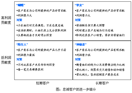 CRM廠商和業(yè)界普遍認(rèn)為:只要贏得了客戶的忠誠,企業(yè)將"財源滾滾";因此企業(yè)在培養(yǎng)客戶忠誠方面的開支在逐步上升。因為從表面上看來,客戶滿意度、客戶忠誠度和客戶保留度越高,客戶利潤貢獻(xiàn)度就大。但事實并不如他們所愿,《哈佛商業(yè)評論》最新的論文,研究表明:客戶滿意度、客戶忠誠度與客戶利潤貢獻(xiàn)度的關(guān)聯(lián)程度比預(yù)期的要小得多。企業(yè)應(yīng)當(dāng)對忠誠客戶再進(jìn)行細(xì)分,然后在更細(xì)化的客戶基礎(chǔ)上對其進(jìn)行分類管理,并采取相應(yīng)的對策。在論文中,作者根據(jù)利潤貢獻(xiàn)度大小與客戶的短長期兩個維度,將忠誠客戶進(jìn)行了深層次細(xì)分。主要分成四類:"蝴蝶"、"摯友"、"陌生人"、"神秘者"。企業(yè)應(yīng)該根據(jù)每一類的情況采取相應(yīng)的對策。管理那些能使企業(yè)盈利但不忠誠的客戶--"蝴蝶"--的關(guān)鍵是,在他們購物時盡可能地從他們身上獲利。對那些既能帶來利潤又忠誠的客戶--"摯友",細(xì)心呵護(hù)他們則更為恰當(dāng)。至于那些忠誠但不能帶來利潤的客戶--"藤壺",你需要做的是確定他們是否有增加消費(fèi)的潛力。最后,對于"陌生人"--那些既不忠誠又沒有利潤可賺的客戶,答案當(dāng)然很簡單:早點認(rèn)出他們,不對他們做任何投資。