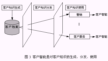 客戶知識是人們通過實(shí)踐認(rèn)識到的、與客戶有關(guān)的規(guī)律性,而客戶智能是獲得客戶知識并使用客戶知識求解問題的能力。客戶智能是對企業(yè)戰(zhàn)略決策真正有價值的事物和行動?蛻糁悄懿粌H包括了客戶知識的生成,而且更強(qiáng)調(diào)了客戶知識在企業(yè)中的分發(fā)、使用,直到產(chǎn)生客戶智能。所以,客戶智能是對客戶知識的生成、分發(fā)和使用(圖3)。