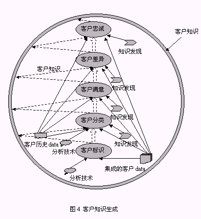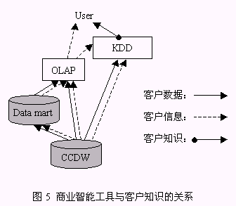 從以上構(gòu)成系統(tǒng)的三個組件的介紹中同時可以找到對以下兩個問題的答案:1、客戶數(shù)據(jù)、客戶信息、客戶知識之間的區(qū)別(圖5):由來自于事務(wù)系統(tǒng),如ERP、SFA等的源數(shù)據(jù)經(jīng)整理后放入CCDW或數(shù)據(jù)集市,這一過程處理的對象稱為客戶數(shù)據(jù);OLAP為決策人員提供了展示有意義的客戶數(shù)據(jù)的機(jī)制,這種有意義的客戶數(shù)據(jù)稱之為客戶信息;客戶數(shù)據(jù)和客戶信息均可以通過KDD技術(shù)的運(yùn)用,提升為對決策有價值的客戶知識。2、客戶知識生成的途徑:從對第一個問題的解答中可以知道,客戶知識從KDD作用的對象來看有兩種途徑:KDD作用于客戶數(shù)據(jù)、KDD作用于客戶信息,總之,客戶知識生成是依賴于KDD過程的復(fù)雜的過程。