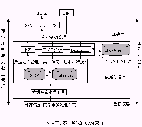 圖6是本文給出的以客戶智能為核心的I-CRM系統(tǒng)架構(gòu)。從數(shù)據(jù)源層來的客戶數(shù)據(jù)經(jīng)過ETL(抽取、轉(zhuǎn)換、裝載)、清洗后以數(shù)據(jù)存儲層的CCDW或數(shù)據(jù)集市的形式存儲。應(yīng)用支持層是提供了報表查詢、OLAP、知識發(fā)現(xiàn)分析決策工具,作用于客戶數(shù)據(jù),該過程產(chǎn)生的有價值的客戶知識存儲于動態(tài)知識庫中;訉犹峁┝薎-CRM利用客戶知識從而有效實(shí)施其功能的場所。該架構(gòu)具有以下特點(diǎn):