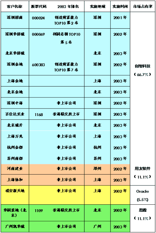 在國務(wù)院發(fā)展研究中心企業(yè)研究所、清華大學(xué)房地產(chǎn)研究所和搜房研究院共同發(fā)起評比的"中國房地產(chǎn)TOP10"中已經(jīng)有3家企業(yè)導(dǎo)入CRM,它們是:居財(cái)富創(chuàng)造能力TOP10第2位的深圳招商;居利潤總額TOP10第5位的深圳華僑城;居財(cái)富創(chuàng)造能力TOP10第7位的深圳金地。截止2003年10月底,只有創(chuàng)智科技公司為"中國房地產(chǎn)TOP10"提供了房地產(chǎn)CRM解決方案。
