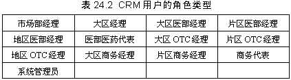 另外,對(duì)CRM系統(tǒng)的用戶(hù)也進(jìn)行了明確的定義,按照工作性質(zhì),以及本著能夠快速高效地共享信息,提高銷(xiāo)售能力和工作效率的原則,確定表24.2所示的CRM用戶(hù)的角色類(lèi)型。