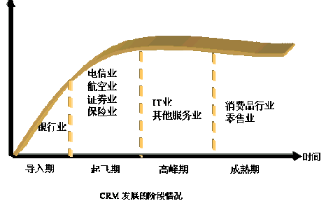 從圖中我們可以大致看出CRM的發(fā)展情況。保險,電信行業(yè)對這比較重視,而且得到了一定的應(yīng)用。但是在其他行業(yè)中的發(fā)展仍然比較緩慢。面對中國的龐大市場,從CRM的發(fā)展中不難看出:會隨著經(jīng)濟的發(fā)展得到長足的發(fā)展。隨著經(jīng)歷早期客戶是蒙昧期,后來是觀察期,現(xiàn)在是選擇期,CRM市場可能出現(xiàn)爆炸性的增長。CRM本身是很好的,發(fā)展到一定階段,引導(dǎo)期已經(jīng)過了,又會發(fā)展起來。