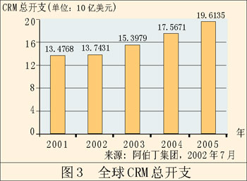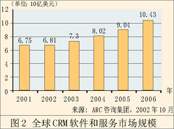 單單這還不是惟一能夠說明問題的。早在2002年,F(xiàn)orrester研究公司就聲稱,來(lái)自CRM的收入將從428億美元增長(zhǎng)到738億美元。AMR研究公司同樣預(yù)測(cè),這個(gè)領(lǐng)域會(huì)不斷增長(zhǎng)。AMR的調(diào)查表明,91%的公司會(huì)在這方面增加開支,預(yù)計(jì)總開支會(huì)增長(zhǎng)8%。值得一提的是,AMR所指的這一塊市場(chǎng)是“客戶管理”,而不是較為傳統(tǒng)的CRM,這說明CRM應(yīng)用軟件的作用發(fā)生了轉(zhuǎn)變。