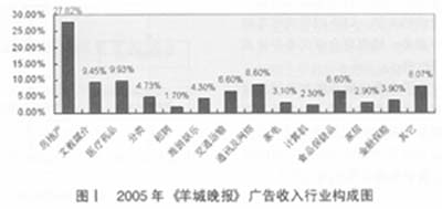 廣告客戶在報紙投放廣告的目的在于說服讀者成為其產(chǎn)品或服務的消費者,他們最感興趣的是向那些最有可能成為其消費者的讀者做廣告,而“報紙讀者與廣告目標受眾的相關(guān)性決定了廣告信息是否能夠到達廣告客戶所希望的人群”。為此,廣告客戶更愿意在其目標消費群接觸率高的報紙上投放廣告。由于《羊城晚報》的讀者群具有學歷較高、職業(yè)較穩(wěn)定、收入較高、消費能力較強等特點,因此成為房地產(chǎn)、汽車、電訊、家具等耐用消費品行業(yè)塑造品牌的平臺。另外,《羊城晚報》的讀者以家庭訂戶為主,他們對健康、教育、休閑、娛樂比較關(guān)注,因此醫(yī)藥、文化教育、食品保健品、旅游等廣告在羊城晚報也占有較大比例(見圖Ⅰ,統(tǒng)計期間為2005年1月-10月)。
