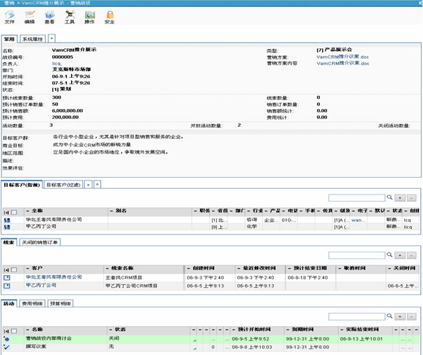 VamCRM的營銷戰(zhàn)役,可以自動統(tǒng)計有多少線索成功轉(zhuǎn)化為業(yè)務(wù)機(jī)會,有多少線索最終簽單,從而使得企業(yè)相關(guān)管理人員可以對營銷戰(zhàn)役的效果得到直觀的量化評估,對市場活動的投資收益做到心中有數(shù)。