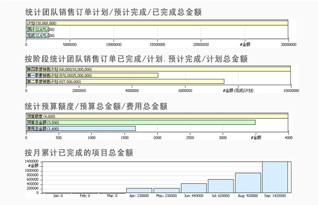 在VamCRM項目組合管理中集成項目數(shù)據(jù)的統(tǒng)計與分析,可以直接監(jiān)控項目計劃、預(yù)計及完成的項目數(shù)量、總金額和費用的統(tǒng)計,也可按月累計已完成的項目數(shù)量、總金額和費用,直接衡量項目實施的結(jié)果與效益。在費用管理模塊中集成費用數(shù)據(jù)的統(tǒng)計與分析,對于所有費用可以按人及費用類型進(jìn)行統(tǒng)計,實時知道哪一個人或哪一類費用開銷最多,以及費用與預(yù)算的對比分析。